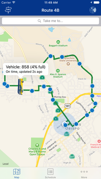 SLO Transitを使用すると、ユーザーはバスのリアルタイムの位置を簡単に追跡できます。アプリは地図上にルートを表示し、バスの進行状況を視覚的に追うことができます。バスの位置に基づいた到着予想時刻(ETA)は、ユーザーがより効率的に旅行を計画するのに役立ちます。